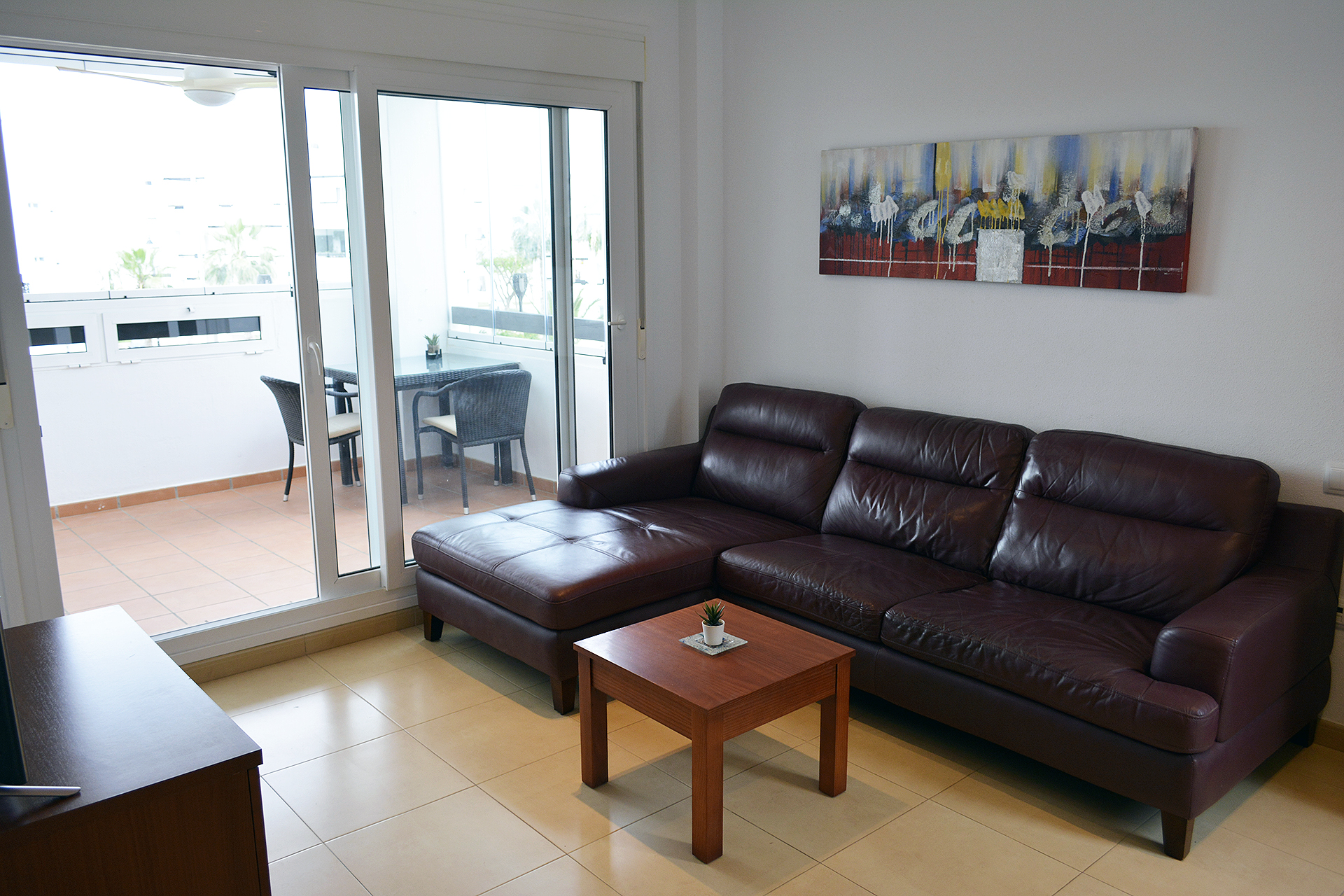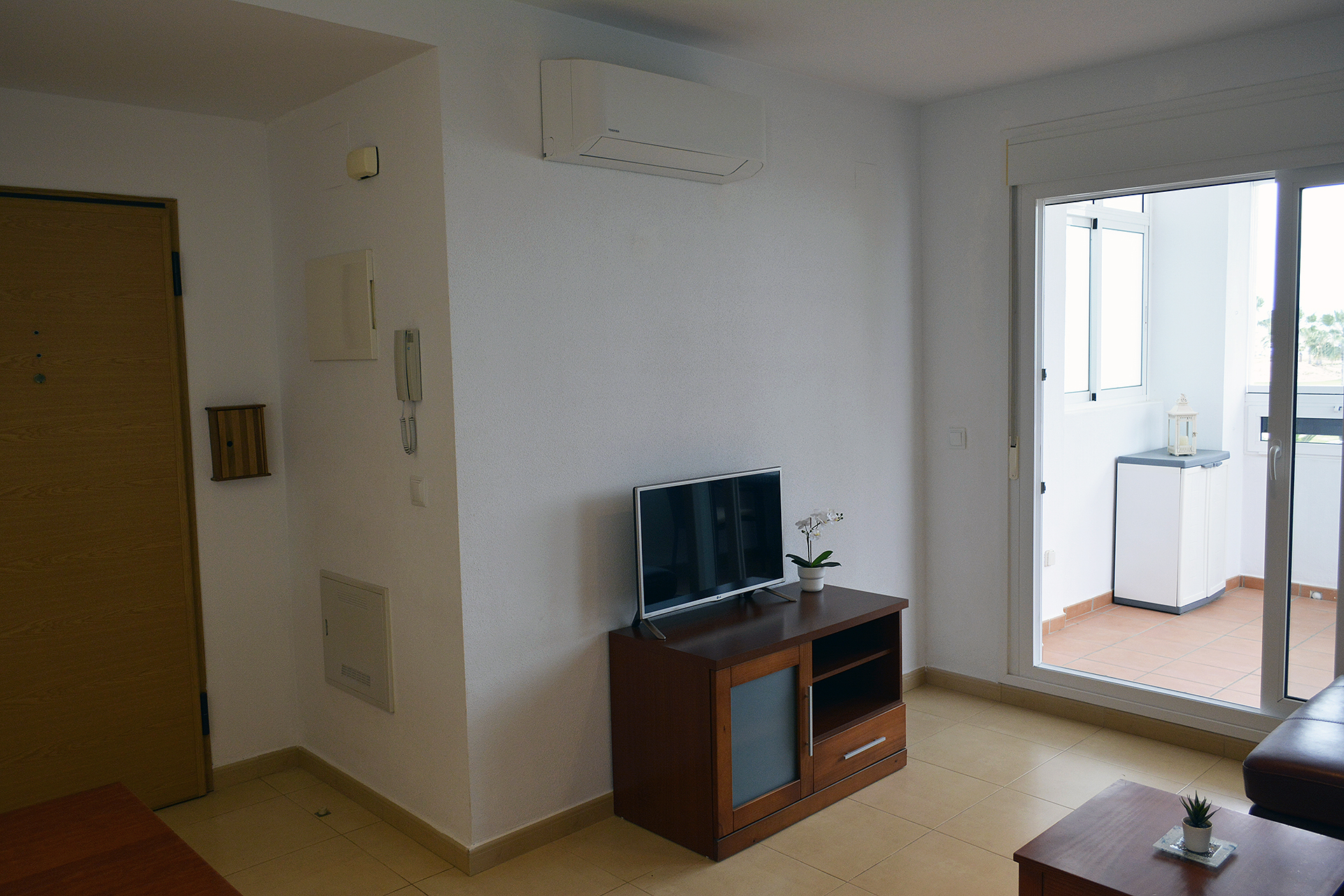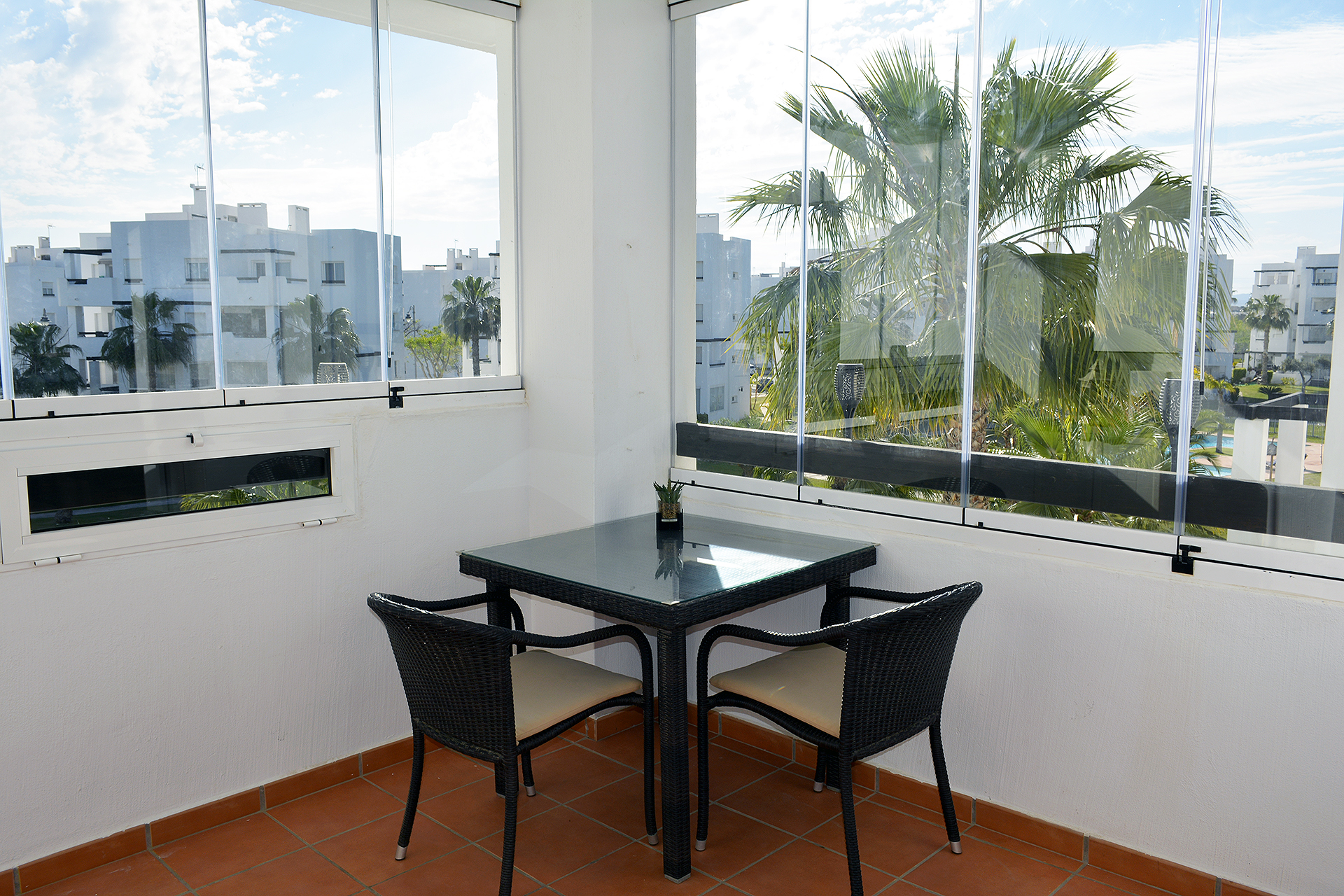 This apartment in phase 1 belongs to the biggest two bedroom apartments that were built in Las Terrazas De La Torre Golf Resort. Therefore the living room, with an extra window, and kitchen are larger than the the other two bedroom apartments.