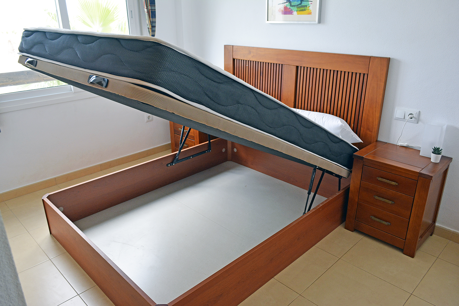 – Double bed 150 x 200 with new/unused mattress and pillows. (Ottoman Bed Frame for extra storage).